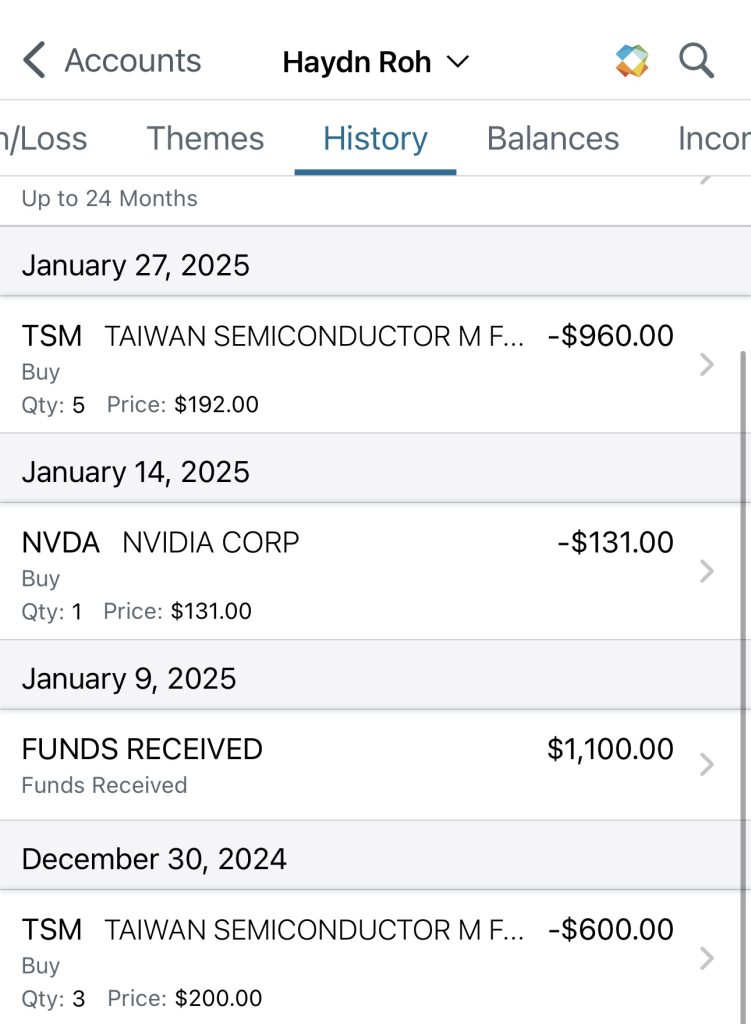 On January 8, 2025, I turned 15. For my birthday, I decided to give all the money I had saved, along with my birthday gifts, to my mom and added another $1,100 so she could deposit it for me. With that, I picked up 1 share of NVIDIA at $131 and 5 shares of TSM at $192 each.