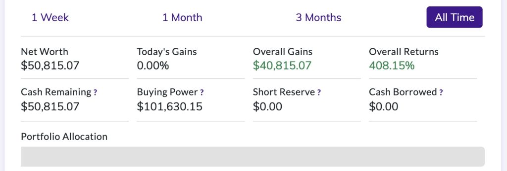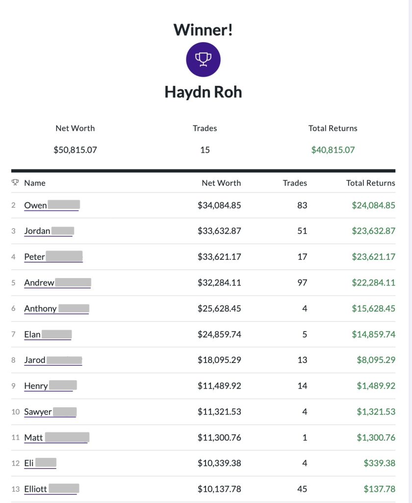 Seeing my name at the top of the leaderboard felt unreal. We started with $10,000 in virtual money, and by the end of the semester my portfolio reached $50,815.07. That is an overall gain of $40,815.07, or about 408 percent.