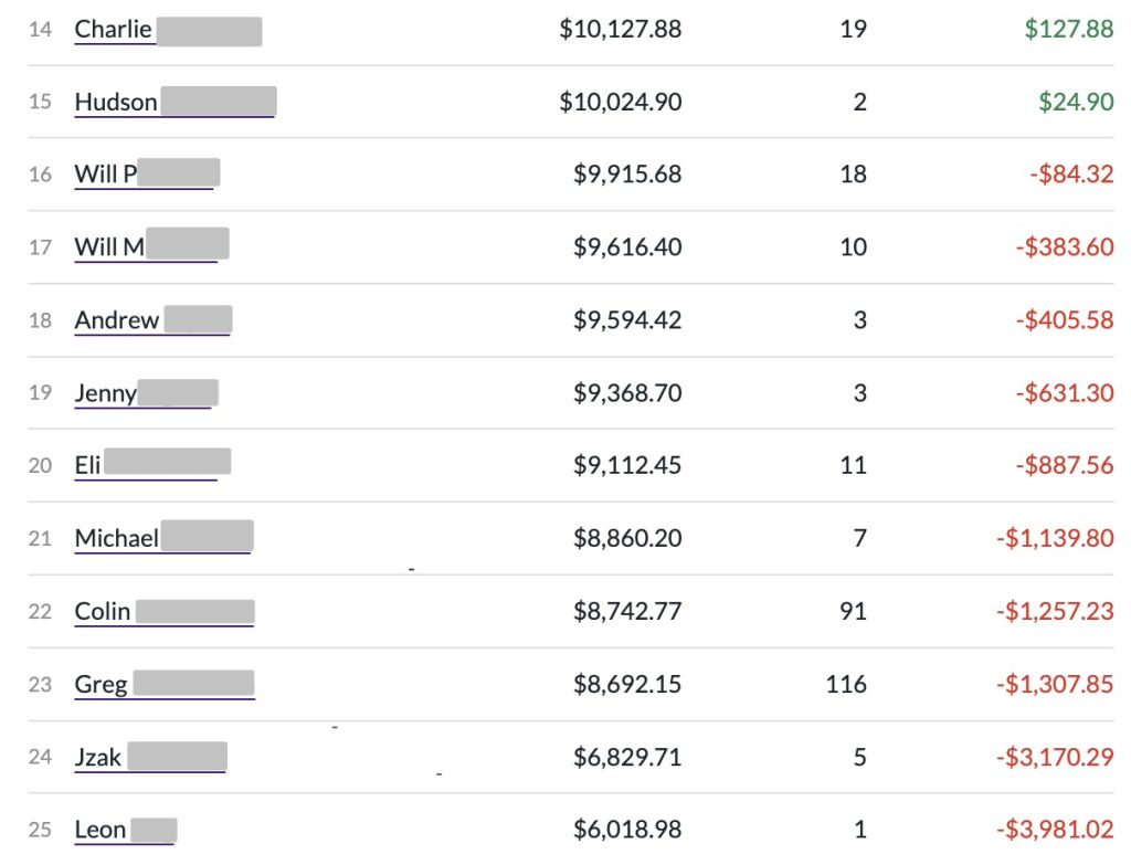 One more thing that really stuck with me was where the rankings started to turn negative. From around 16th place and below, portfolios began showing losses instead of gains. Some were small, but others were not. The last place student especially stood out. He used margin heavily and took extreme risks. His portfolio completely collapsed.