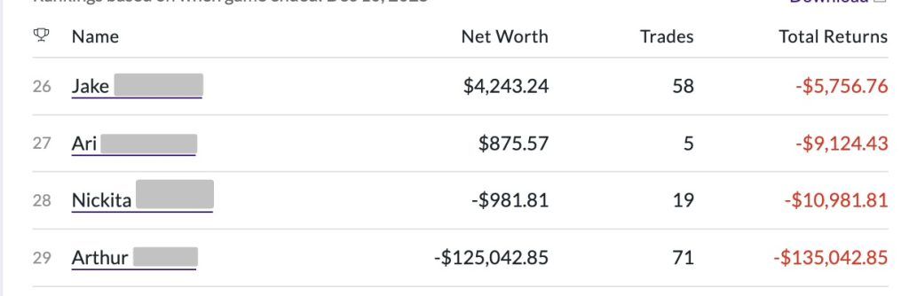 Looking at the rankings taught me a lot. Students who traded very often tended to struggle more. Some ended up deep in the negative. Others tried to recover losses by trading even more aggressively, which usually made things worse. Virtual money makes it feel easier to take risks, and I felt that temptation too, especially when I saw friends making fast gains.